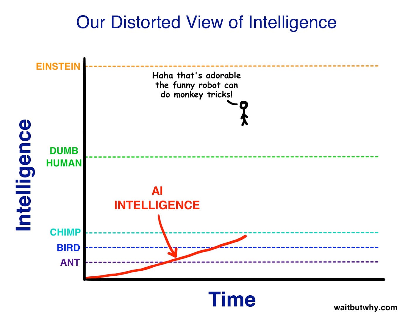 The article showed a simple chart. AI intelligence on the vertical axis, time on the horizontal. The curve starts below ant level. Climbs through bird, chimp. Approaches the "Dumb Hum an" line. A stick figure watches it arrive, arms crossed: "Haha, that's adorable, the funny robot can do monkey tricks."